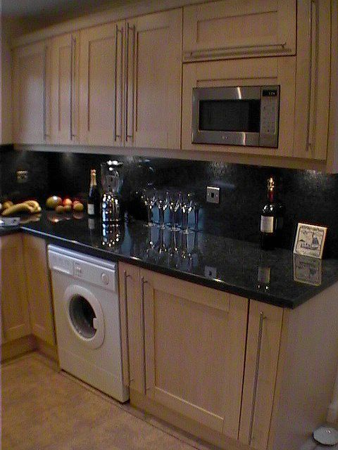 This kitchen has maple doors and stainless steel bar handles. With high gloss very dark granite effect laminated worktops and matching wall panels we also fixed paneling to the window sills and sides which helps to give a clean look and also makes the kitchen appear wider.
