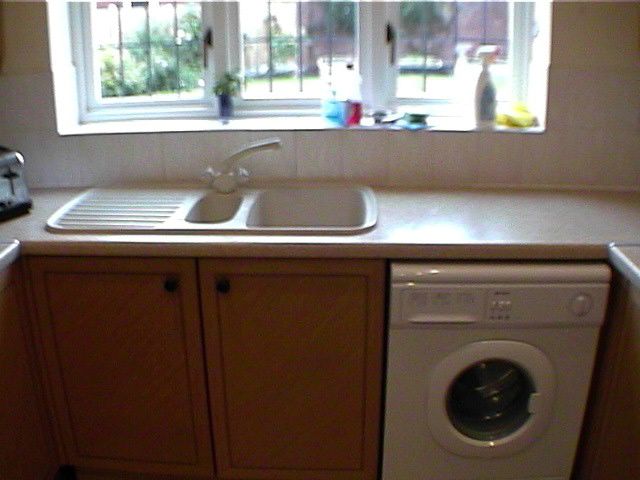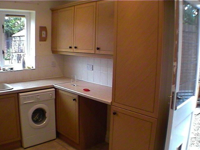 The base units are deeper than standard as are the wall units on the right hand side, into which we made the special wall unit to house a microwave. Under the microwave are special narrow base units, housing pull out chrome towel rails and storage racks with a built in larder fridge. The kitchen now includes a slimline dishwasher under the sink and a curved glass extractor over the stainless steel double oven, the finishing touch being matching brushed steel wall sockets.